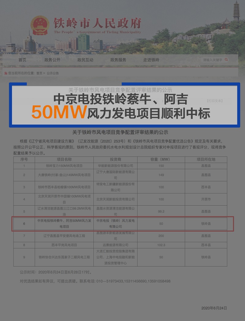2020年06月24日 ,铁岭市人民政府发布公示,中京电投铁岭蔡牛、阿吉50MW风力发电项目顺利中标。