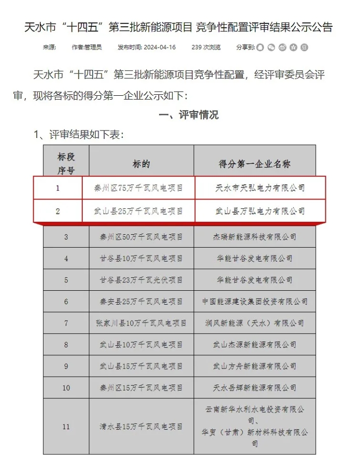 2024年4月18日,甘肃省天水市发布《天水市“十四五”第三批新能源项目竞争性配置评审结果公示公告》。